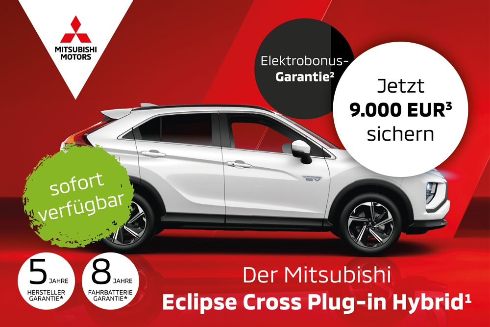 1| Antrieb: 4WD 2.4 Benziner 72 kW (98 PS), Elektromotoren vorn 60 kW (82 PS) / hinten 70 kW (95 PS), Systemleistung 138 kW (188 PS) 2| Garantieangebot der MMD Automobile GmbH für Privat-und Gewerbekunden. Bestellen Sie bis zum 15.11.2022, solange der Vorrat reicht , einen Mitsubishi Eclipse Cross Plug-in Hybrid. Wenn Sie nachweislich den staatlichen Umweltbonus nicht erhalten, weil die Lieferung des Fahrzeugs herstellerseitig so spät erfolgt ist, dass eine fristgerechte Zulassung und Antragstellung in 2022 unmöglich war, übernehmen wird die Innovationsprämie. Dies gilt nur, sofern die Voraussetzungen für den Erhalt des staatlichen Umweltbonus im Übrigen gegeben waren (mehr Informationen unter www.bafa.de). 3|Unverbindliche Preisempfehlung der MMD Automobile GmbH, ab Importlager, zzgl. Überführungskosten, Metallic-, Perleffekt- und Premium-Metallic-Lackierung gegen Aufpreis. 4| Hierin ist bereits der vom Automobilhersteller zu tragende Anteil am Umweltbonus enthalten. Genaue Bedingungen auf www.elektro-bestseller.de 5| Voraussetzung ist die Genehmigung des Förderantrags durch das BAFA. 6| Empfohl. Aktions-Rabatt Eclipse Cross Plug-in Hybrid BASIS1 der MMD Automobile GmbH, Aktion gültig bis 31.12.2022. 6| Mit einer Tankfüllung und voller Ladung der Batterie. Veröffentlichung der MMD Automobile GmbH, Emil-Frey-Straße 2, 61169 Friedberg